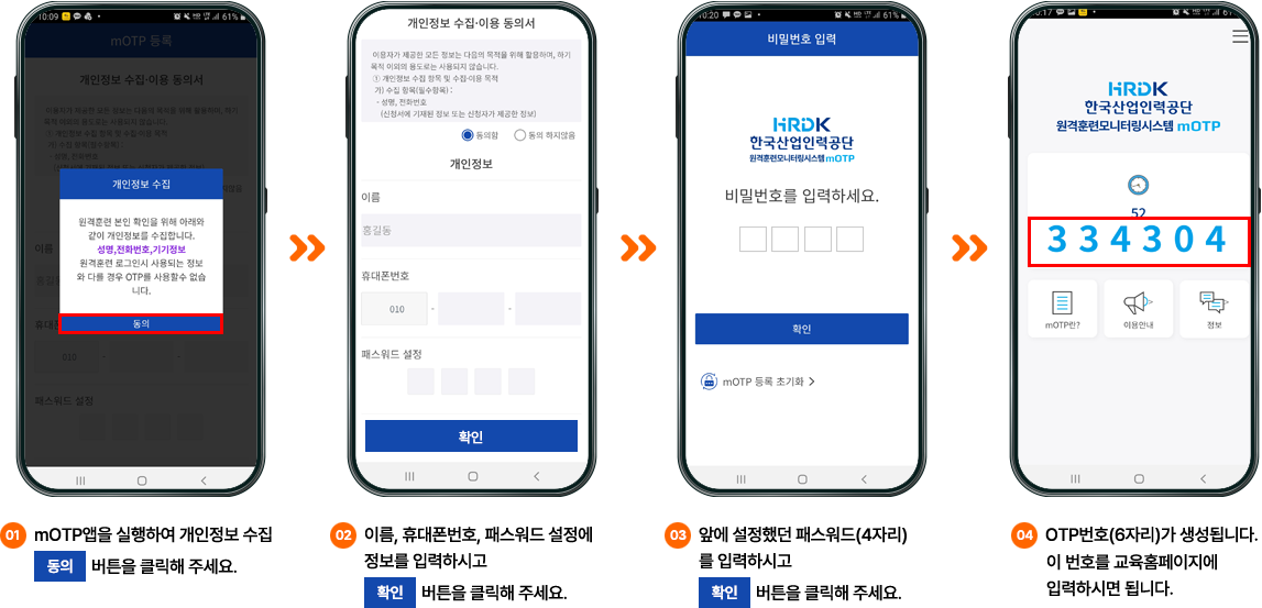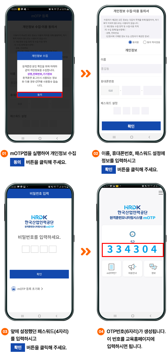 STEP 02 설치된 원격훈련 mOTP앱을 실행하여 개인정보수집 동의를 클릭 후 가입정보를 입력합니다.