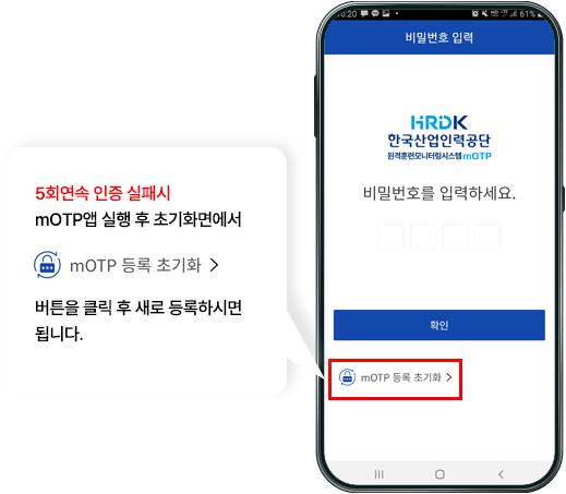 STEP 04 5회연속 인증 실패시 원격훈련 mOTP앱에서 mOTP 등록 초기화 버튼을 클릭하셔서 새로 등록하셔야 합니다.
